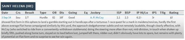 Having opened at 6-1 in the morning, Saint Helena was originally the mount of Rhys Flint, with McCoy set to partner stable companion Into The Wind.
