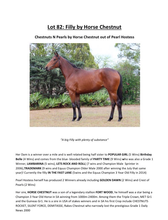 Horse Chestnut, sire of lot 82, was probably the greatest racehorse ever bred in South Africa. A former J&B Met winner and Triple Crown hero, Horse Chestnut has also made his mark at stud. His current runners include top Grade 1 performer Rake’s Chestnut and the very exciting feature race prospect Bold Inspiration. This bay filly, christened Chestnuts N Pearls, is a half sister to talented stakes winner Golden Dawn and is from the great Party Time family, responsible for last season’s Equus Champion Filly In The Fast Lane. This lovely filly has been described as "a big filly with plenty of substance."