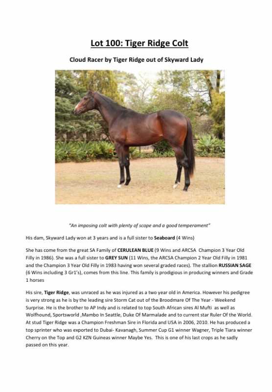 Cloud Racer is the name of lot 100, a bay colt by A P Indy’s half brother Tiger Ridge. The latter did well at stud before his premature death, with his top runners including Gr1 Summer Cup winner Wagner, millionaire Kavanagh, Royal Ascot hero Strike The Tiger, and Graded winner Isphan to name a few. Out of a daughter of champion sire Badger Land, this well bred colt’s relatives include champions Cerulean Blue, Grey Sun and promising sire Russian Sage. He is "an imposing colt with plenty of scope and a good temperament."