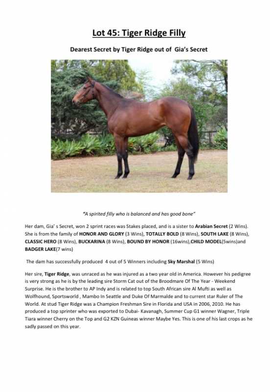 Lot 45 is a daughter of Storm Cat’s son Tiger Ridge, sire of brilliant fillies Cherry On The Top, Leah’s Secret and Maybe Yes, to name but three. Named Dearest Secret, this bay miss is a half sister to no fewer than four winners, and her siblings include talented Gr2 performer Sky Marshall. Out of a stakes placed half sister to Gr3 winning filly Honour And Glory, this filly is closely inbred to the great broodmare Lassie Dear. The vendor describes her as "a spirited filly who is balanced and has good bone."