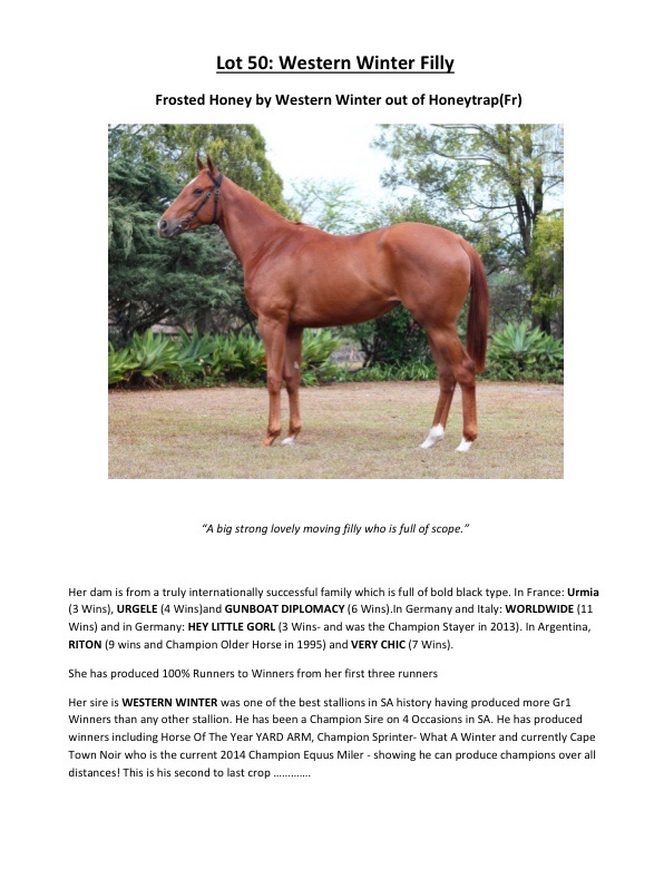 Western Winter is the sire of lot 50, a filly who shares her sire with the outstanding female athletes Bad Girl Runs, Covenant, Fair Maiden, and Roxanne. Going by the name of Frosted Honey, this nicely bred filly is a sister to three winners, and is out of a French stakes placed mare. This is a top international family, and this filly’s relatives include numerous stakes winners and high class performers overseas. She is described as “a big, strong, lovely moving filly, who is full of scope”. Pertinently, she is from the second last crop of her sire, three times champion in South Africa.