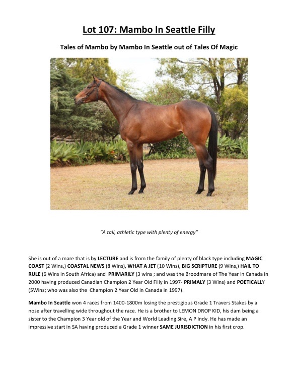 Last of the Ambleway draft is lot 107, a filly named Tales Of Mambo. By sensational young sire Mambo In Seattle, already the sire of a Grade 1 winning filly in Same Jurisdiction, this filly is out of a half sister to four stakes horses and hails from the family of top US Grade 1 winner Citronnade, who is by Mambo In Seattle’s close relative Lemon Drop Kid. Thus, Tales Of Mambo is a genetic sibling of a US Grade 1 winner! She is "a tall, athletic type with plenty of energy."