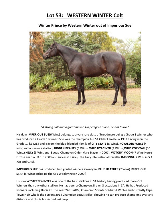 Lot 53 is another son of the great sire Western Winter, whose offspring include 19 individual Grade 1 winners. The well named Winter Prince is from an equally distinguished female line. His dam Imperious Sue was an Arcsa Champion and one of the few fillies ever to win the Cape’s greatest race – the Gr1 J&B Met. Winter Prince’s siblings include Grade 1 winning Navarone filly Imperious Star as well as high class Winter Oaks winner Blue Heather. This superbly bred colt is described as “a strong colt and a great mover. On pedigree alone, he has to run.”