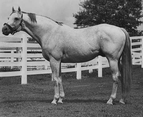 Of further, purely academic interest, is the fact that MAJMU's 7th dam is a full-sister to one of the greatest gray horses of all time - the 'Gray Ghost of Sagamore' NATIVE DANCER (photo below) - whose blood permeates the breed today - with him being maternal-grandsire of NORTHERN DANCER, and paternal-grandsire of MR PROSPECTOR.