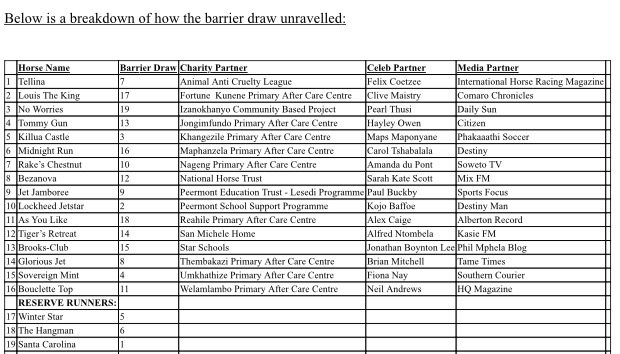 The final field of 16 horses for the Gr 2 R600 000 event was announced at the function and this was followed by a ceremony to determine the barrier draws for the race as well as the celebrity and charity that each runner will be representing.