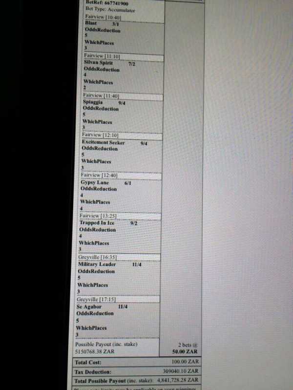 10 years 11 months ago - 10 years 11 months agoDave Scott wrote: If you were realistically trying to take a bet via the tote the last few winners would drop dramatically with the amount of winning tickets and your last 11/4 shot would be paying R1.10 for a win