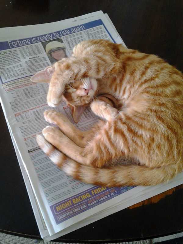 Maybe the cat is trying to give you a tip when he sits on the racing page. Watch where he puts his paws next time.