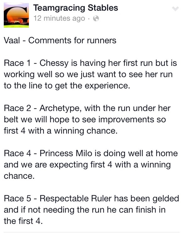 11 years 2 months ago - 11 years 2 months agoMerchy wrote: I like a bit of Formal Request in Race 5, decent debut when 3rd behind Sir Cecil (runs in race 3 today). The runner up was only 0.20 lengths ahead of him that day and De Melo chose to keep the ride instead of jumping on the form horse and likely favourite Respectable Ruler.