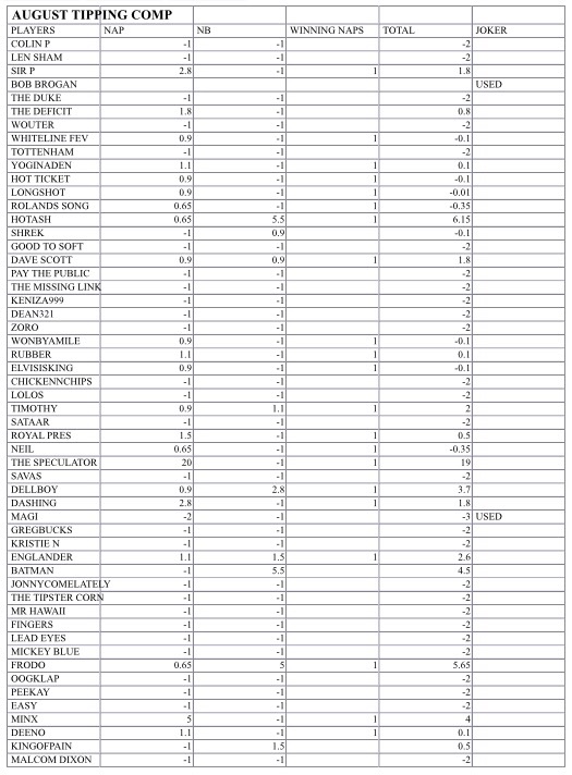 points will be awarded at bookmakers odds and a plus or minus running total will be kept for the month for each PLAYER