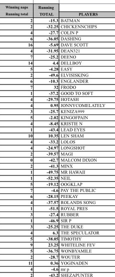 In the end it was just Lady Luck smiling down on me - I ended on 32 points, but had I not been lucky enough to pick the right longshot (Miesque's Storm this past Saturday on the Vaal sand), I would have ended up in the negative - so hard luck to the Clanners who came close - I think there were about 8 guys that could still win it yesterday had their longshot selections delivered. :ohmy: