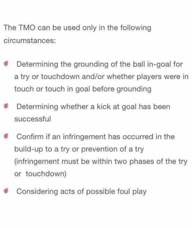 maybe we should just clarify that the ref IS NOT ALLOWED TO REFER to the tmo as the technology can only be used for the act of scoring a try or an act of foul play ..as stu Wilson joel stransky and George gregan said its a disgrace at the abuse he has received as he called it as he saw it without all the help the critics have ...