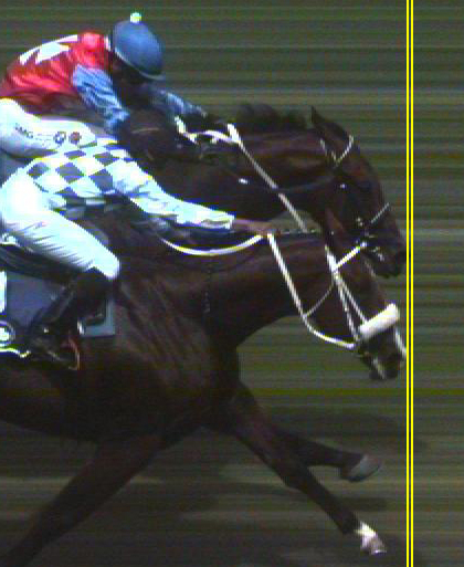 i think a pixel difference, never mind whisker or hairline - but the inside horse's nose is definitely touching the second yellow line. The white nose is touching the first yellow line.