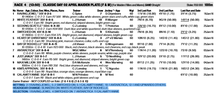 I know Ryan Munger quite well and he is a honest boy and he said the filly did not go down particularly well - When a horse pays R9 a place and drifts from a punting stable then I would think anybody that picked her was guessing the changes would improve. There was money for Banker's Delight in the previous race from the same stable and it ran in the bush . With such a small market in Kim if somebody put 1k with the books it would have shortened dramatically.
