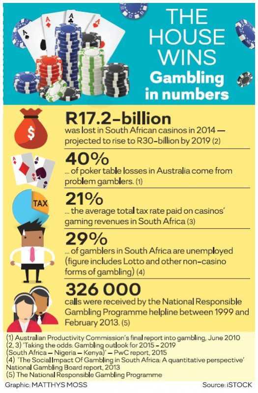 But these rosy figures do not account for gamblers' losses. South Africans bled R17.2-billion in casinos in 2014, according to a PwC report - an average of R314 for every citizen. When averaged for gamblers only, the losses are much steeper: Industry insiders say that patrons of a major casino, many of whom are low earners, lose an average of nearly R3,000 a month.