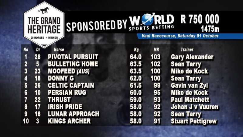 9 years 2 weeks agoA full field of 28-runners and two reserves have been unveiled for the inaugural running of The Grand Heritage, sponsored by World Sports Betting, at the Vaal Racecourse on 1 October.
