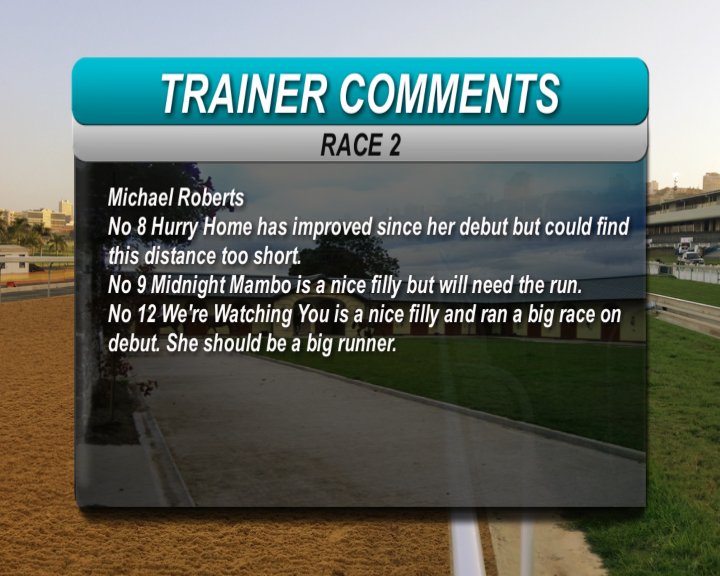 race 2:We're watching you - got a bad start last time and run on very well to run second just behind the winner. EXPECT A WINNING PERFORMANCE TODAY!!!!!