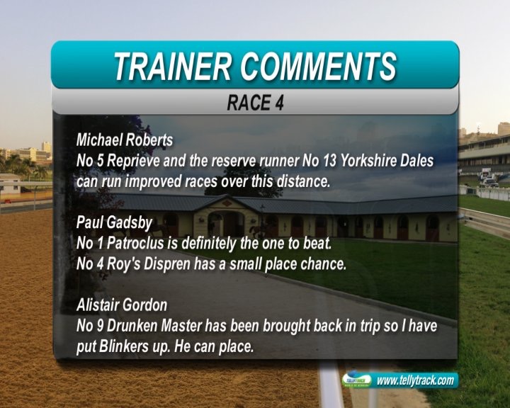 Race 4: Patroclus(1) 8-10 (Don't like tipping odds on but this field is so weak, take swingers and exactas with Roy's Dispren(4) 18-1)