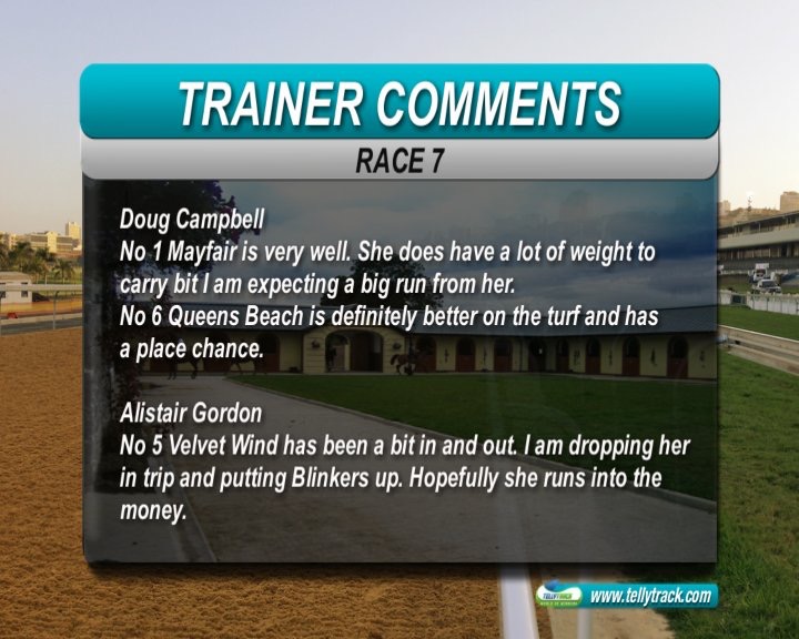 Race 7: Queen's Beach(6) 22-1 (3rd run after rest, last run was changing legs and ran down field. Will be fitter now and has a in-form appie claim of 2.5kg. WATCH!!!!!!)