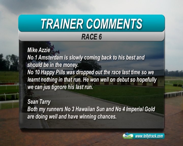 Race 6: Hawaian Sun (3) and imperial Gold (4) - Tarry two horse race, not much to choose between them, I'm sure both will challenge strongly at the finish.