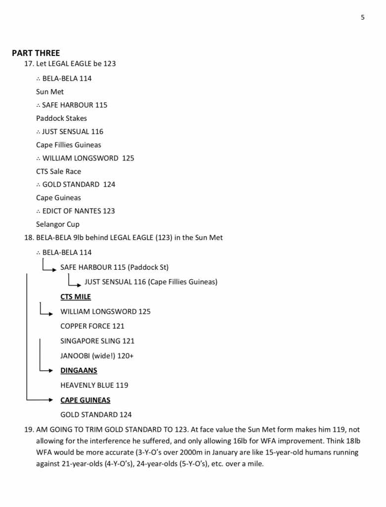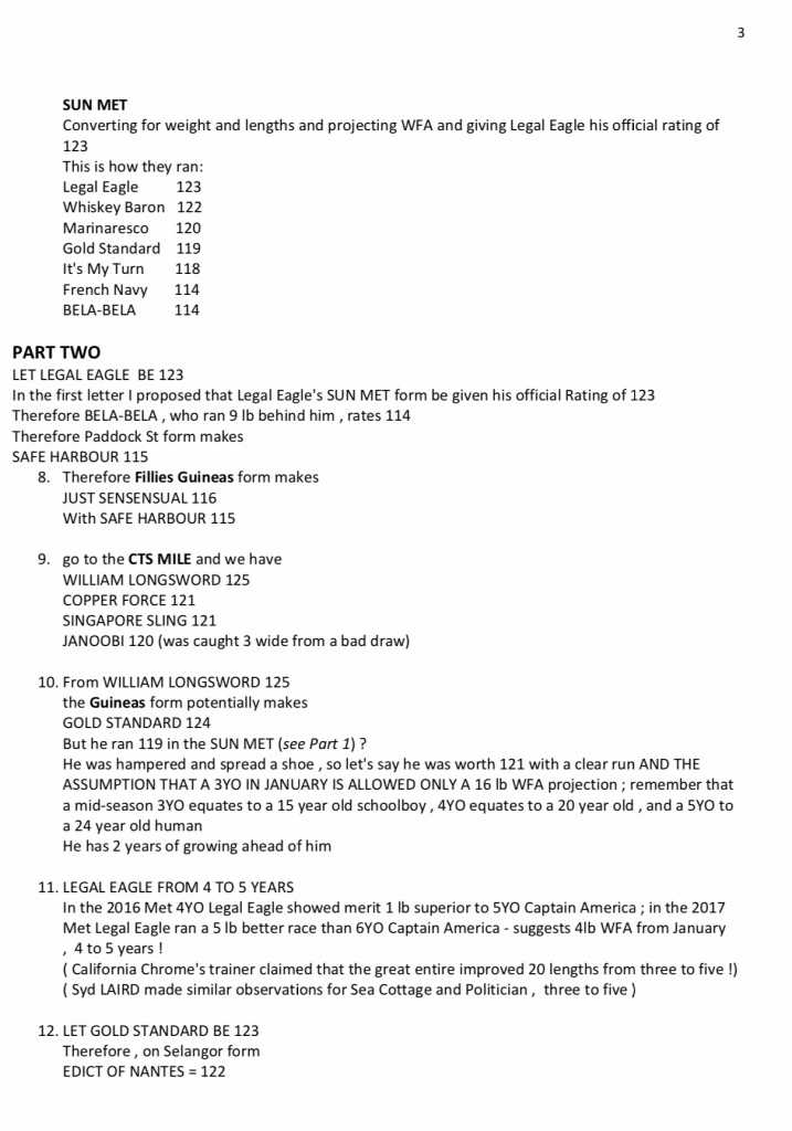 2. Maybe I'm missing something in his explanations, but I could not find how (based on the Met figures? ) he came to William Longsword being a 125? My own ratings (using what he terms a 'flawed' WFA scale) do not have him that high - which of course means that all the other 3yr olds are lower as well ... and also not sure that Legal Eagle ever achieved 123 .... any way great article and always something to learn ....