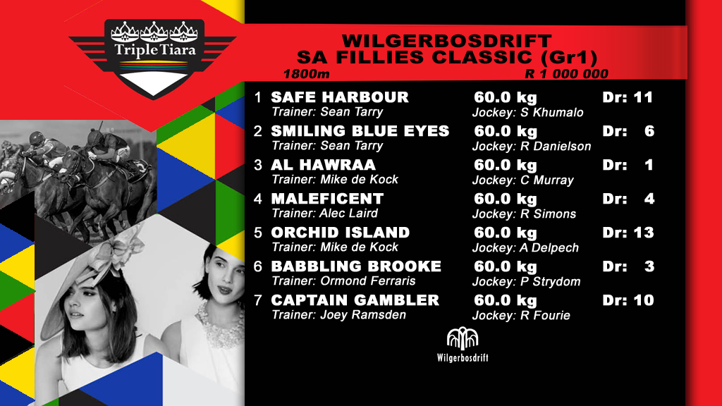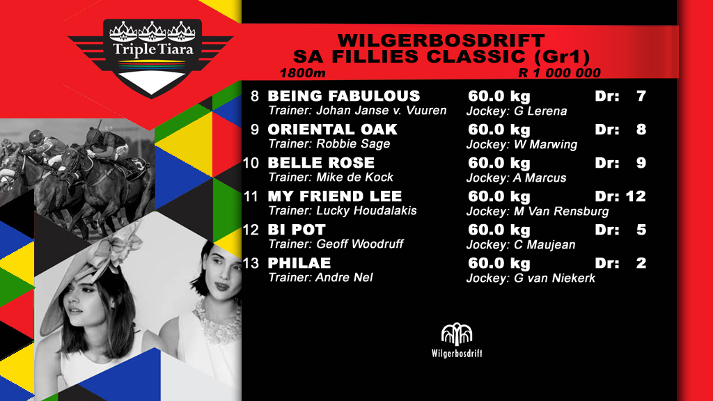 Final field for the R1-million Wilgerbosdrift SA Fillies Classic (Grade 1) (2nd Leg SA Triple Tiara) over 1800m