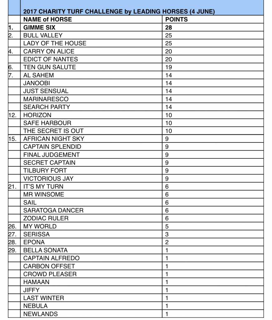 The leader board changed again, with Jelly Jungle Monkey (4) rising to the top with 163 points, 1 clear of CM (6) and a further point clear of Kavasan Moodley (10). This is turning into a real humdinger of a competition, but with the top three entrants having no runners this weekend who is to say there will not be another change come next Sunday? The Gr.2 Post Merchants and Gr.3 Track And Ball Oaks and Derby are the weekend highlights. The full leader board can be found as a pdf on the website.