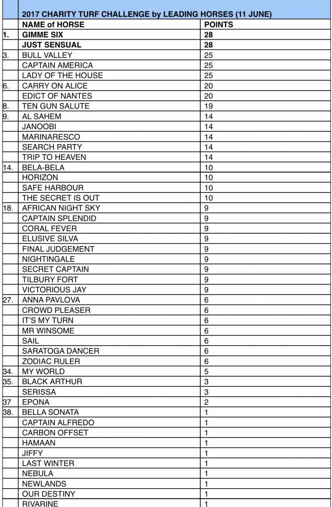 The Daily News 2000 went down to the wire with Edict Of Nantes taking home the 20 points on offer from the SA Derby winner, Al Sahem who secured a valuable 14 points for his followers. Horizon put a below par effort behind when clear of the fourth horse and earned 10 points. In a thrilling finish to the Woolavington 2000, Lady Of The House kept going from the fast finishing Gimme Six and earned a the long shot bonus of 5 points on top of her 20 point haul for winning the Gr.1 event. Gimme Six is now the top point scorer with 28 points and this filly could go all the way this season with other big race options still ahead of her. Safe Harbour gave her followers 10 points for third place. In the final feature of the day, East Cape Derby winner, Captain Splendid, returned to winning form when taking the Gr.3 Lonsdale Stirrup Cup in dogged fashion and earned 9 points. My World and the veteran Greyville specialist, Serissa, earned 5 and 3 points respectively. Newlands was the only other point scorer this week when he earned a point from his Handicap victory in Cape Town.