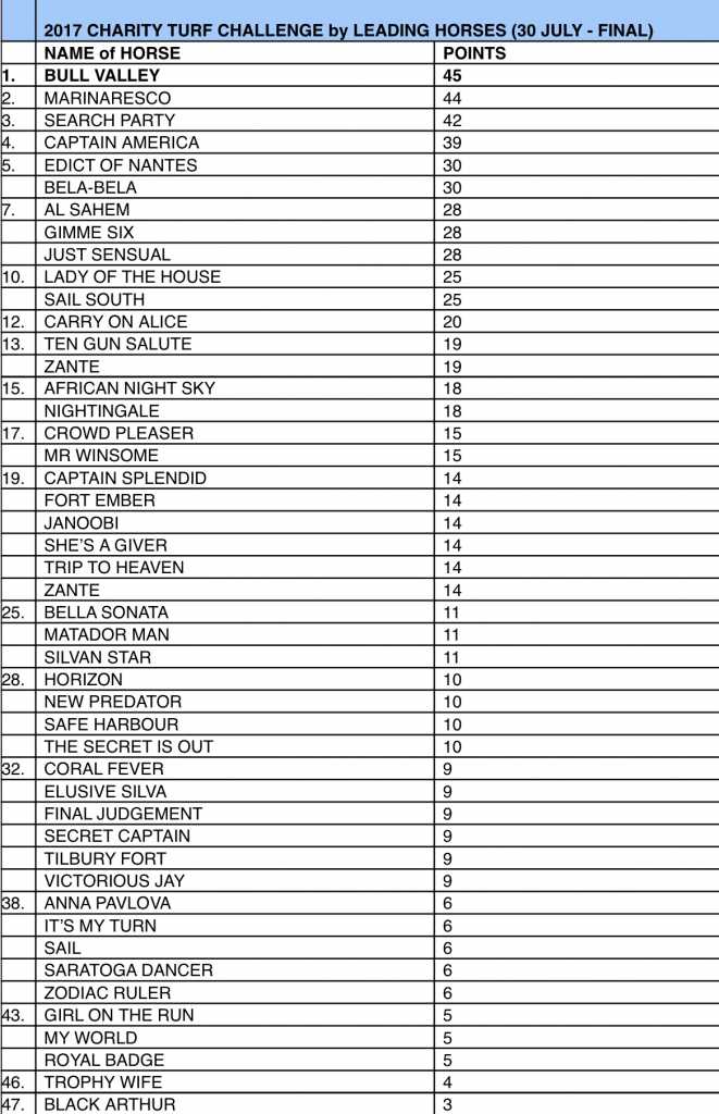 But the day belonged to Premier League July whose 241 points was enough to secure victory and take home the R100 000 first prize! Second prize of R20 000 went to Frodo (1) and third placed CM (6) earned a healthy R10 000 for finishing in third place. Many congratulations to the winners! Please make contact with the Racing South Africa team to ensure prompt payment of your prizes.