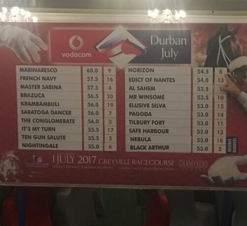 With two reserve runners, the final field together with jockeys and barrier draws was revealed at a special function at Greyville today and considering the recent July Log standings, there were no real surprises although the odd eyebrow might have been raised.