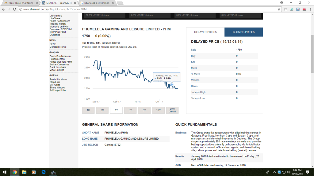 8 years 4 months agoMuhtiman wrote: .....Warren we are mostly sour about what has transpired with this saga.....however should PHUM shares plummet......game over.....the Racing Trust holds around 35% of these shares and I am led believe the magical stakes formula and special RA members additional winning bonus are derived from dividends on these shares.....