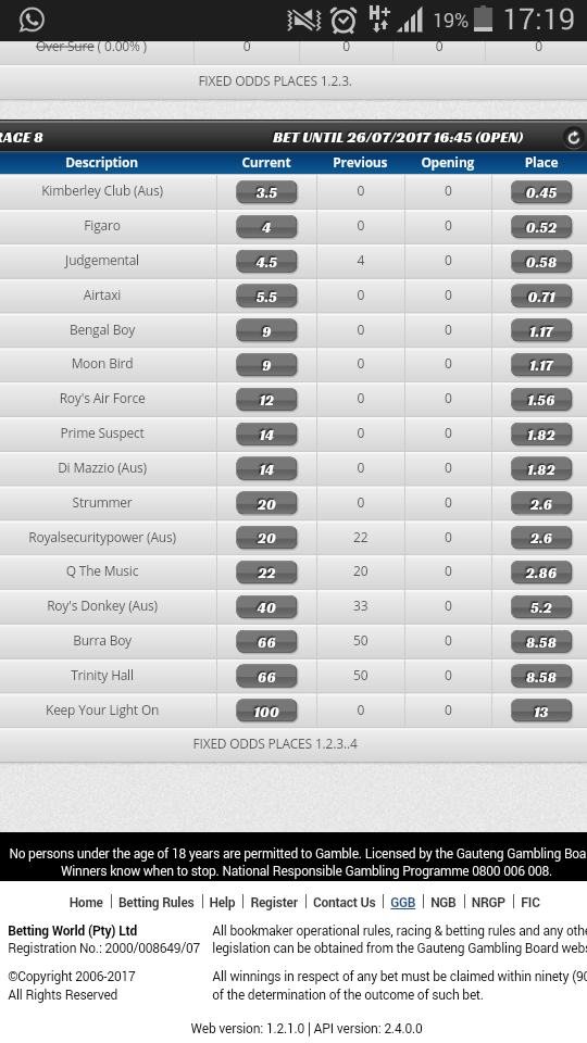 8 years 2 months agodurbs wrote:Backed into 14-1 now and 21-10 first four.You sure you could get 13-1 top four this morning?Brendanr wrote: Keep your Light on in the last achieved an 85 in his last outing this C and D in an allowance plate where he stayed on well in a strong field. Of a 67 today he should be in the top4 if he confirms last run. Looks like the short rest, removal of blinkers and tongue tie seems to have benefitted. Not great that he's unplaced in 7 on turf and unplaced in 6 this C and D but he is a 2 timer winner over the 1200. Peak run and worth a bet imo. Was a huge 13/1 top 4 this am.