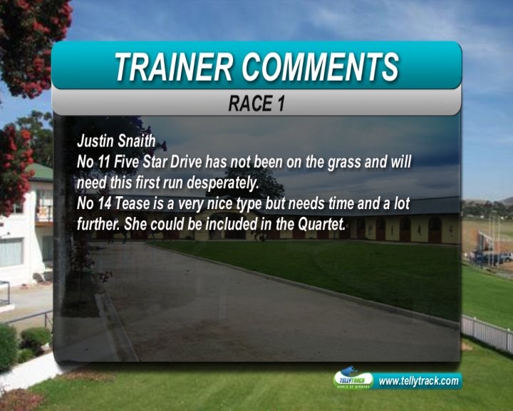 Race 1. Dark Goddess ran a fair race last time- her first after a wind operation. Was scratched a couple of weeks ago- cast in box, and bumped her leg. Was back in work after a couple of days so expect her to run a decent race from a nice draw and has an ew chance. Quite a competitive field. Bendy Bullet has solid form and a good draw; Ostinato would be first pick if not for her wide draw. Evie's Light another that should contest the finish. London Spirit good debut, and although not the best of draws should show significant improvement with the run under her belt. Polly Again and Goa include back end of quartets.