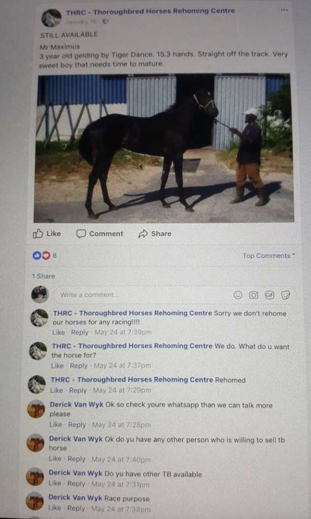 The horses were given to a rehoming center and were stolen. They landed up in Delft and raced in "bush racing".