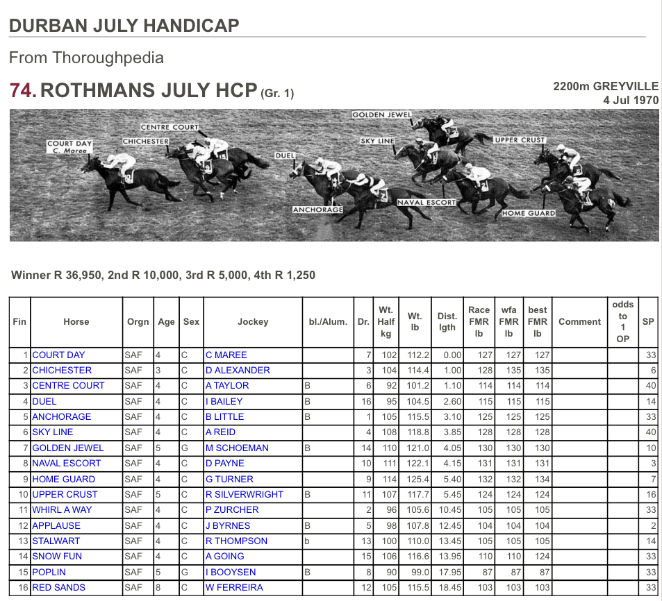 7 years 11 months ago.....and like Court Day....was also a dud at stud.... :huh:Countrymember wrote:Frodo wrote: I recall that Margaret Court was a top woman tennis player - not sure if it was in the same period though; some names in that July picture .... was Home Guard not one of those horses that had winning streak of 9 in a row, or something like that - trained by Mr Henry Eatwell I think