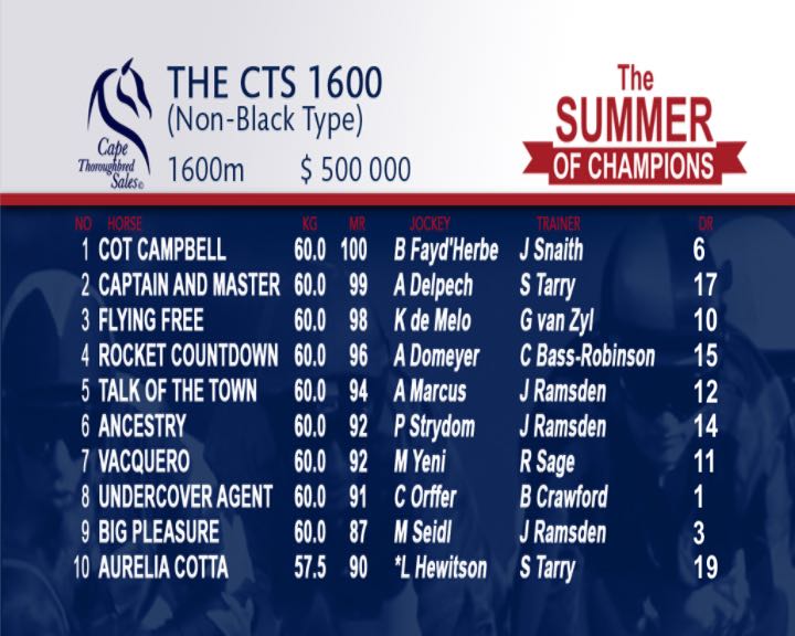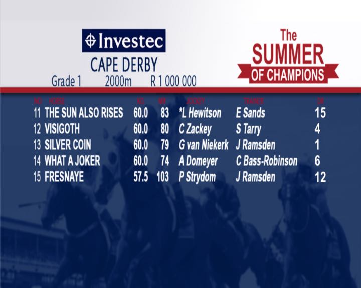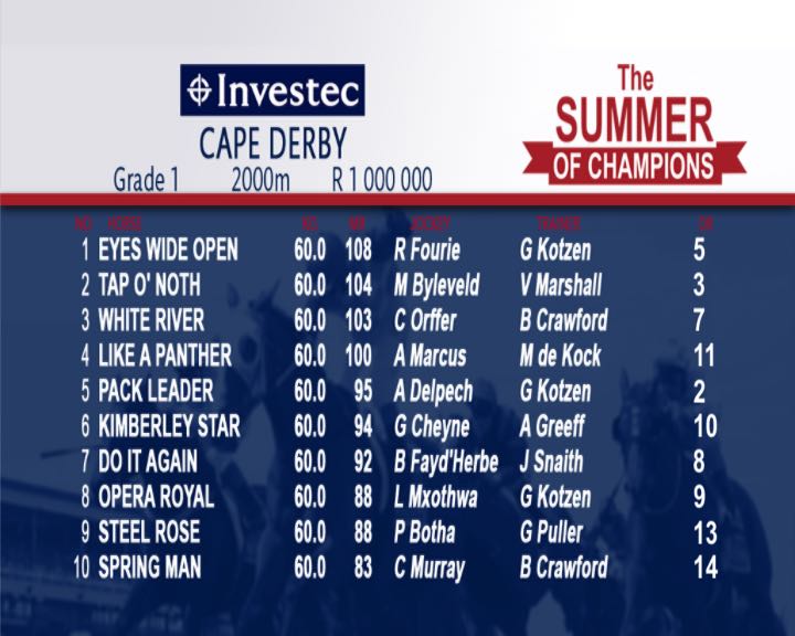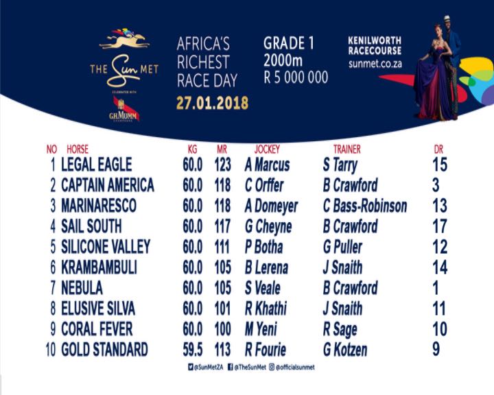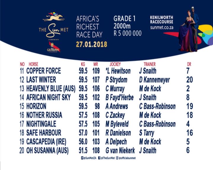 Winter Triple Crown hero African Night Sky did not have much luck in the L’Ormarin’s Queen’s Plate, as he was caught one wide without cover the whole way. Snaith was upbeat about the four-year-old Dynasty gelding’s chances in the Met and said, “That was his second run after a rest in a fast run race and he finished only 2,9 lengths back. Over 2000m, in his third run after a rest, he will finish closer.”