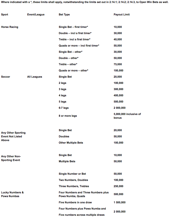 Internet liabilities are set not exclusively, but predominantly for our risk management on horse racing. Our new 5 Million rand payout limit is a Soccer limit. Any limit imposed on an account can be overridden by our sports and racing trading managers. Example: If you have a limit set on your account (For the purpose of Racing risk), but you would like to strike a soccer (or any other sport) bet that exceeds that limit, then please make contact with our Events team and they will be able to assist you.