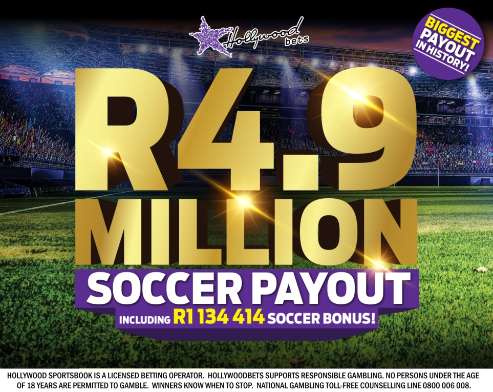 Hollywoodbets – leading the way as the first bookmaker to offer a R5 million payout on soccer bets – has just paid out a massive winning amount of R4,9 million!
