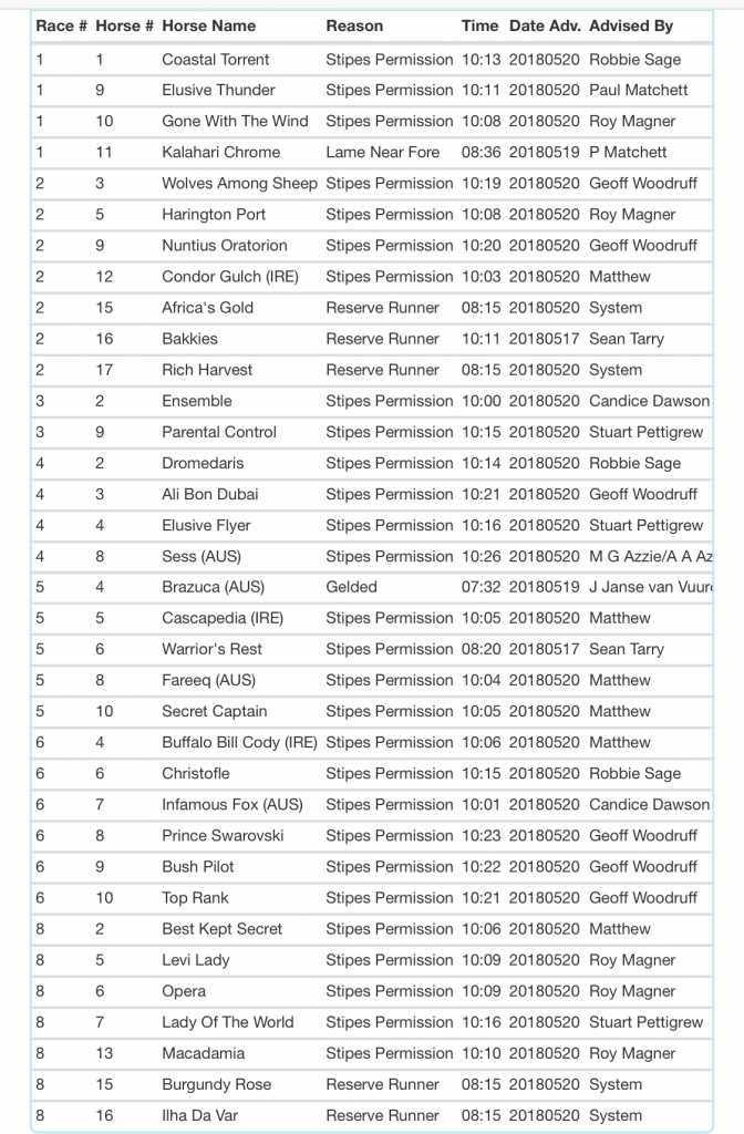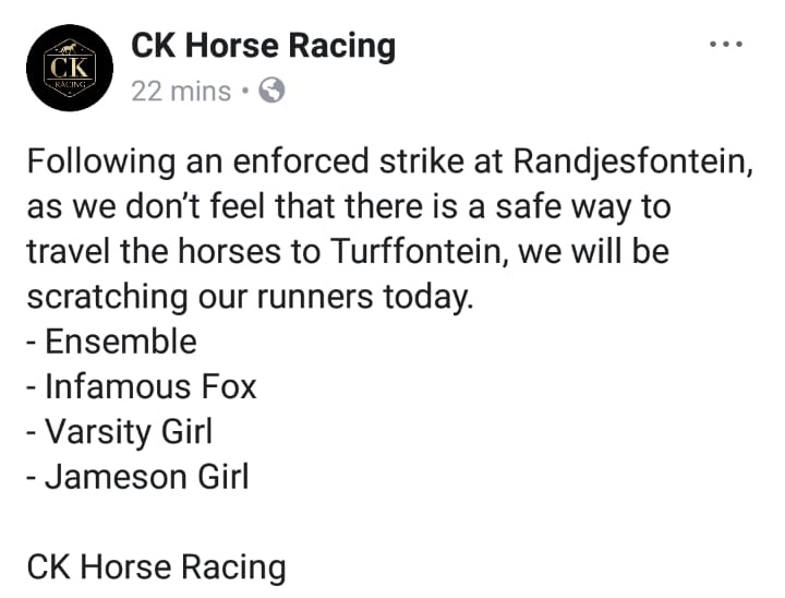 7 years 4 months agoPhumelela were withholding scratchings while they worked out how to get today to go ahead. Trainers today are working their backsides off at raandjies to feed, muck out and give water to their horses in multiple barns as no grooms are around. I would suggest a little more empathy today instead of being worried about your quick fix for the day. You’re thinking is similar to that of Phumelela who are leaving trainers to fend for themselves at raandjies.