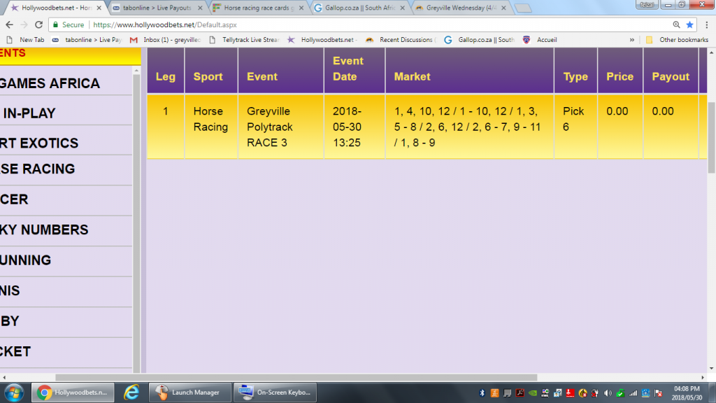 Wednesday 30 MayGreyville A13:21Bet: P6 Race: 3 Cost: 8.00 Percentage: 1+0% Serial: 02004842919251 Runners: 6,11/4/8/6,8/9,11/1......played a perm for much much bigger and a tiny % and am 1 leg out with several in the last....out in the 3rd leg....with JP gone too.... :S