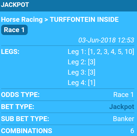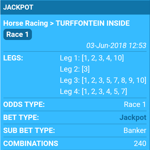 7 years 4 months agoSure but you would think the connections of a horse know it's ability when they punt it heavily.Two posters said they heard good things about Jet Johnson.Lamzat wrote: Guys statistics do not work in SA racing! You have to study the trend and peculiarities and behind the scene information. Yesterday a quiet trainer and breeder won in Mauritius, Kenilworth and Greyville! All his horses won at all the tracks!! Big odds, jackpot. We lose bets cos we are lazy, nobody is ready to study behind the scene information. We just wake up and punt and expect to win.