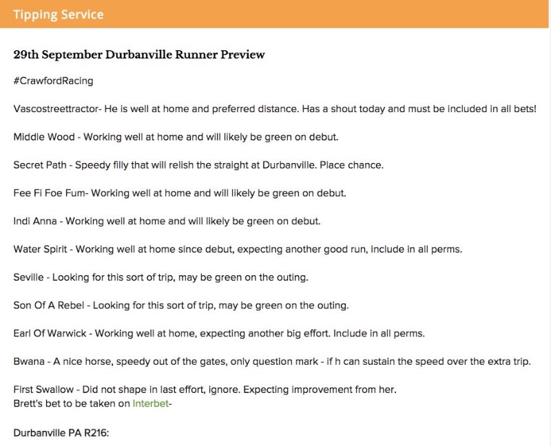 Dr. R, the Crawford benefit day, not so sure sure. The Crawford one i do think is in with a fair winning chance is Earl Of Warwick. He has a strong hand in the first 5 races on the day, so it would appear, however many of his runners are drawn relatively wide in the said races. It's obvious to see the big Cape stables, Bass-Robinson, Crawford, Kotzen and Snaith (in no particular order of importance), are stepping out many of their horses prepping for the up and coming Cape season.