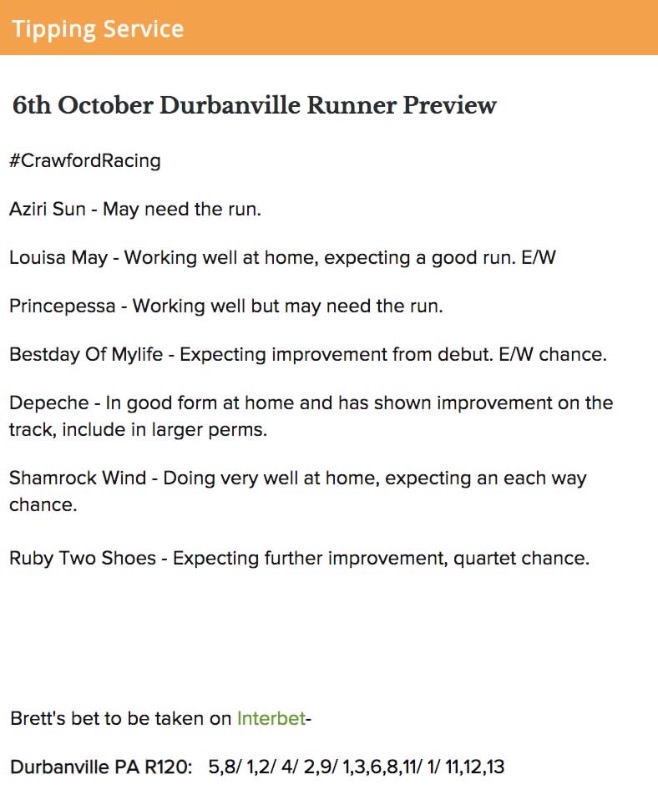 Race 1: Louisa May good debut and will improve on that. Has a good chance from a nice draw but I think the price a bit skinny. Fluttering went close last time and that form is strong, so she is my selection despite wide draw. These two should get you through the bipot, but Alsflamingbeauty, Vomandla, Tropical Hibiscus and Au Revoir have all shown enough to crack their maidens soon.
