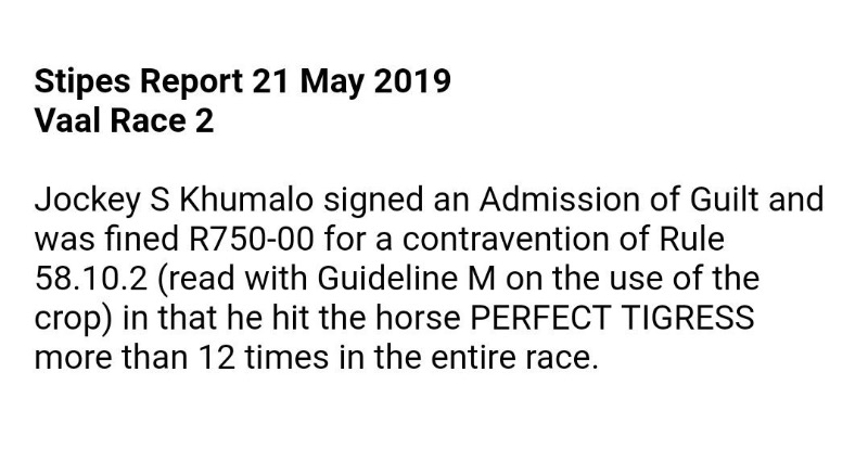 if the rules apply, Khumalo has a ticket coming his way for his ride on Perfect Tigress... Counted about 14 strikes.... Lets see..