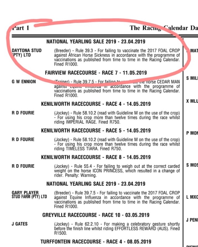 The fines imposed to the breeders are along the same lines. Its cheaper to pay the paltry R1000 and have your horses in impeccable condition for the sale. Than to vaccinate and run the risk of selling the horse for R2000 less.