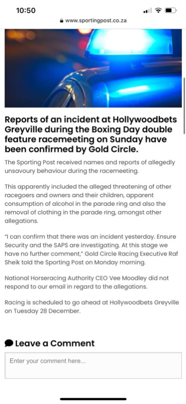 3 years 9 months agoHearing the Calil's caused a ruckus at Greyville, pissed and walking about with bottles of whisky in the parade ring.. No Masks and taking clothes off
