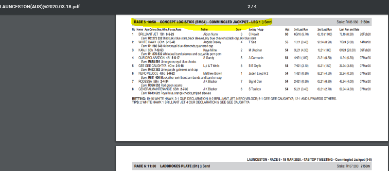 1 Horse Racing Australia LAUNCESTON RACE 5 2020-03-18 10:50 1 - 2, 4, 6 / 2 / 8 / 1, 5 Jackpot
