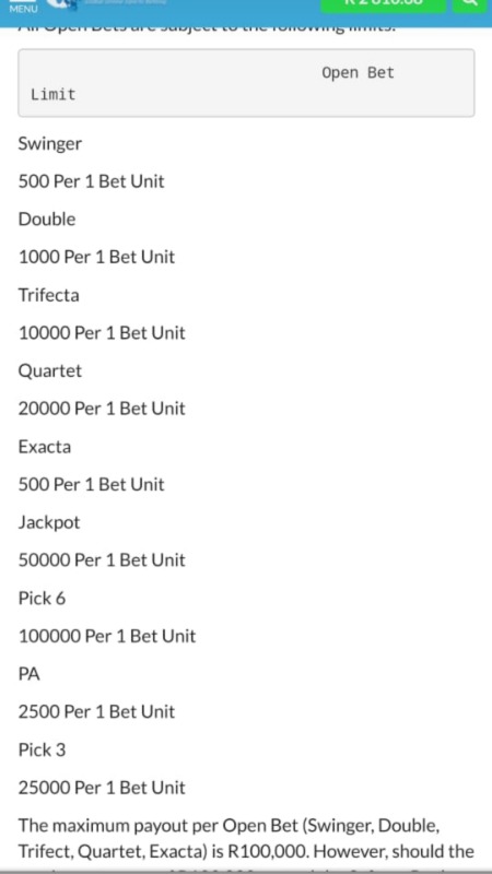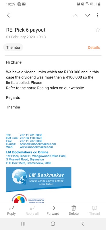 Unbelievable to catch the pick 6 for R20, I spent a fortune and went out. They are right with their payout, but I must say the 100 000 limit is a joke. Instead of 80000 you get 2000, I would be ill. They must be the last bookmaker to have a ridiculous payout dividend limit. I used to hear punters brag about LM bookmakers but now starting to question their judgement.