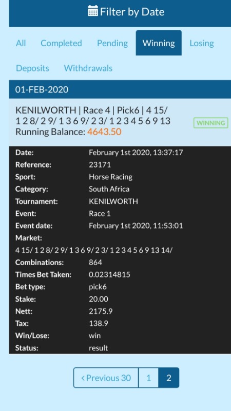 I decided to place a small Pick 6 bet with LM Bookmaker, with what i thought was my Lucky day. I caught 0.02% with R 20, of the R 4,024,269.10 dividend it payed out.