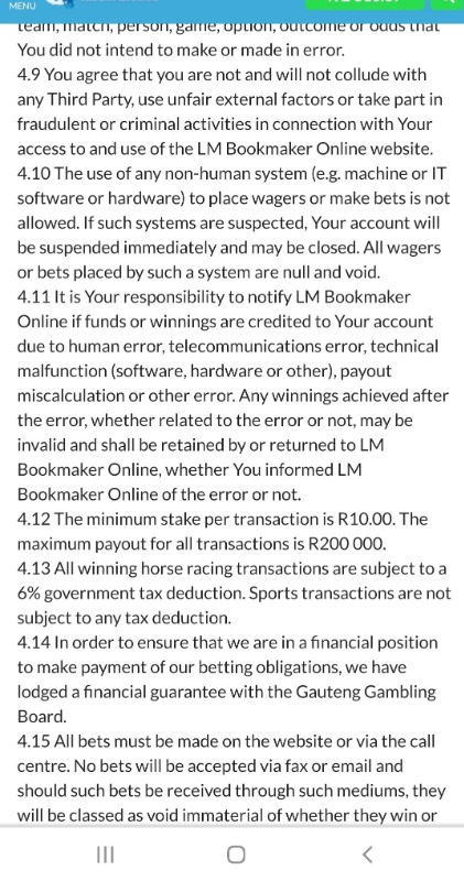 (On such a big race day, of course you want to go for gold. I understand that there are limits but surely when it comes to payouts, you as a bookmaker, should have the credentials to payout a pick 6 under R100 000 without hesitation and not change the terms and conditions as it suits you?)