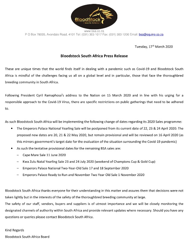 Hope for racing in SA it does happen, basically an entire industry in SA is relying on it happening. Stakes plunge plus no exports would bring bad times to many people, anxiety must be high right now.